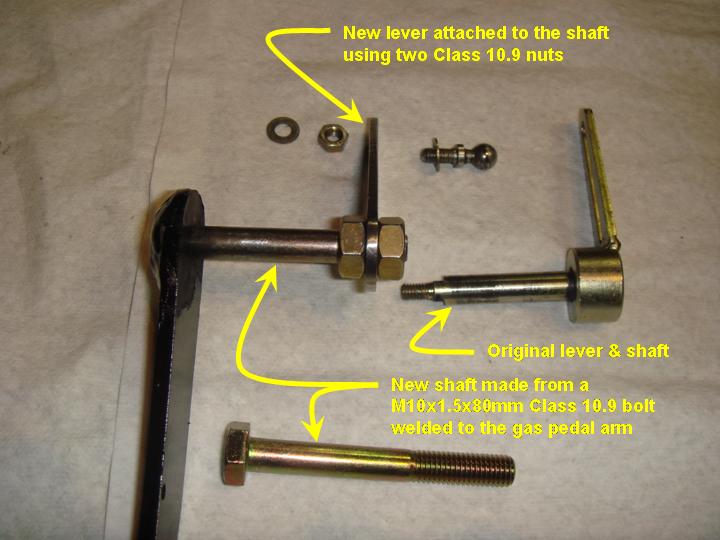 In this solution, the problem joint on the gas pedal arm is now welded solid and the lever now clamps firmly between two class 10.9, M10 nuts. The shaft no longer has the locating double D flats, but the torque capabilities of the M10 nuts is more than ample to hold the lever in position.