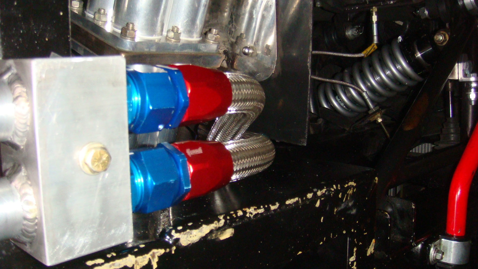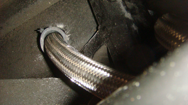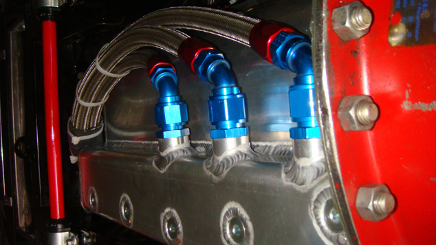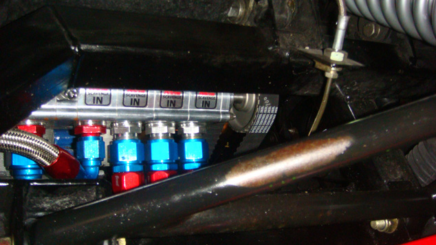 Front of oil manifold and hoses to and from pump