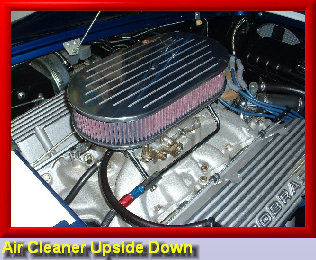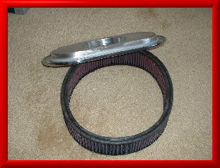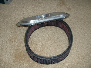 A K&N Round filter PN E-1430 is used. There is enough room on the Holley 850 DP (with no choke linkage) to drop the air cleaner base another 3/4" with some minor throttle lever modification, but